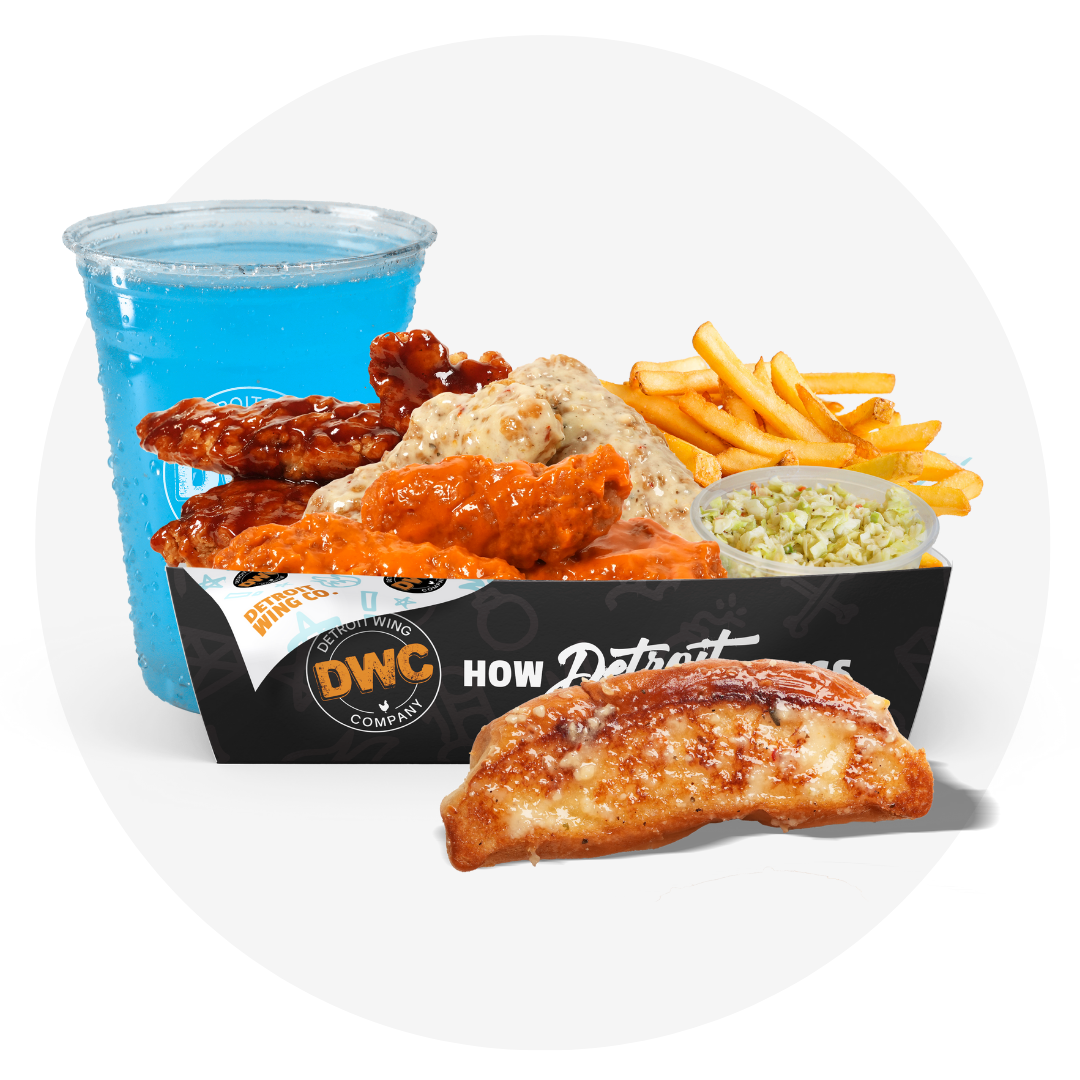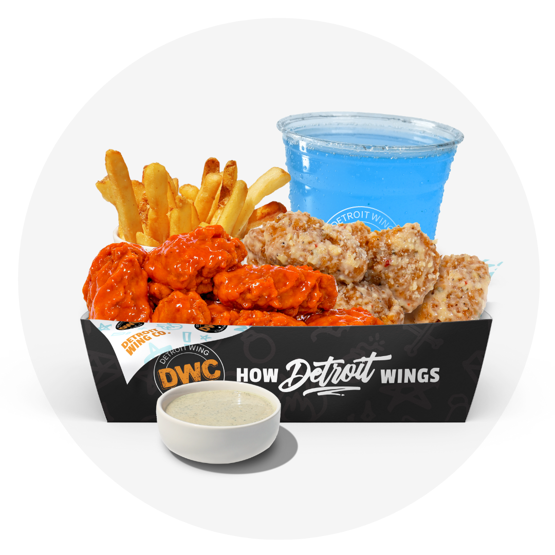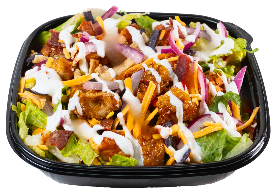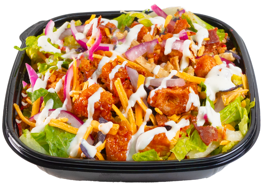 Choice of baked or crispy chicken and sauce, romaine, cheddar, tomato, onion. Served with Ranch Dressing.